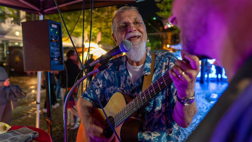 Joachim Schmidt moderiert seine Sendung Music is a beautiful thing am Sonntagabend auf dem Heinerfest. // Bild: Leon Ebersmann